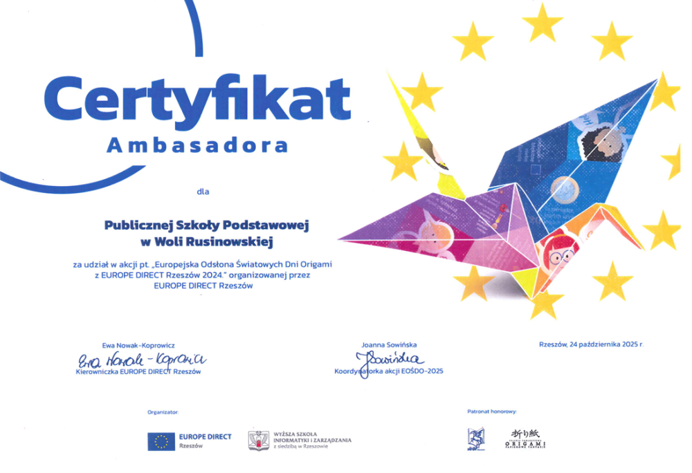 Certyfikat Ambasadora dla PSP w Woli Rusinowskiej