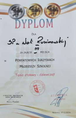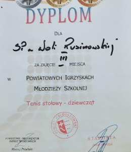 Dyplom dla PSP w Woli Rusinowskiej za zajęcie III miejsca w Powiatowych Igrzyskach Młodzieży Szkolnej - tenis stołowy dziewcząt