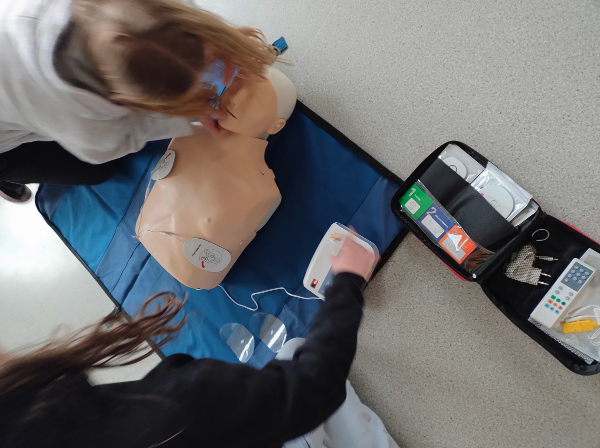 Uczniowie klasy VIII po raz kolejny na lekcji EDB mieli możliwość prowadzenia ćwiczeń praktycznych z udzielania pierwszej pomocy na defibrylatorze szkoleniowym AED XFT-120+ pod okiem mgr Arkadiusza Tereszkiewicza nauczyciela szkoły posiadającego uprawnienia z Kwalifikowanej Pierwszej Pomocy.