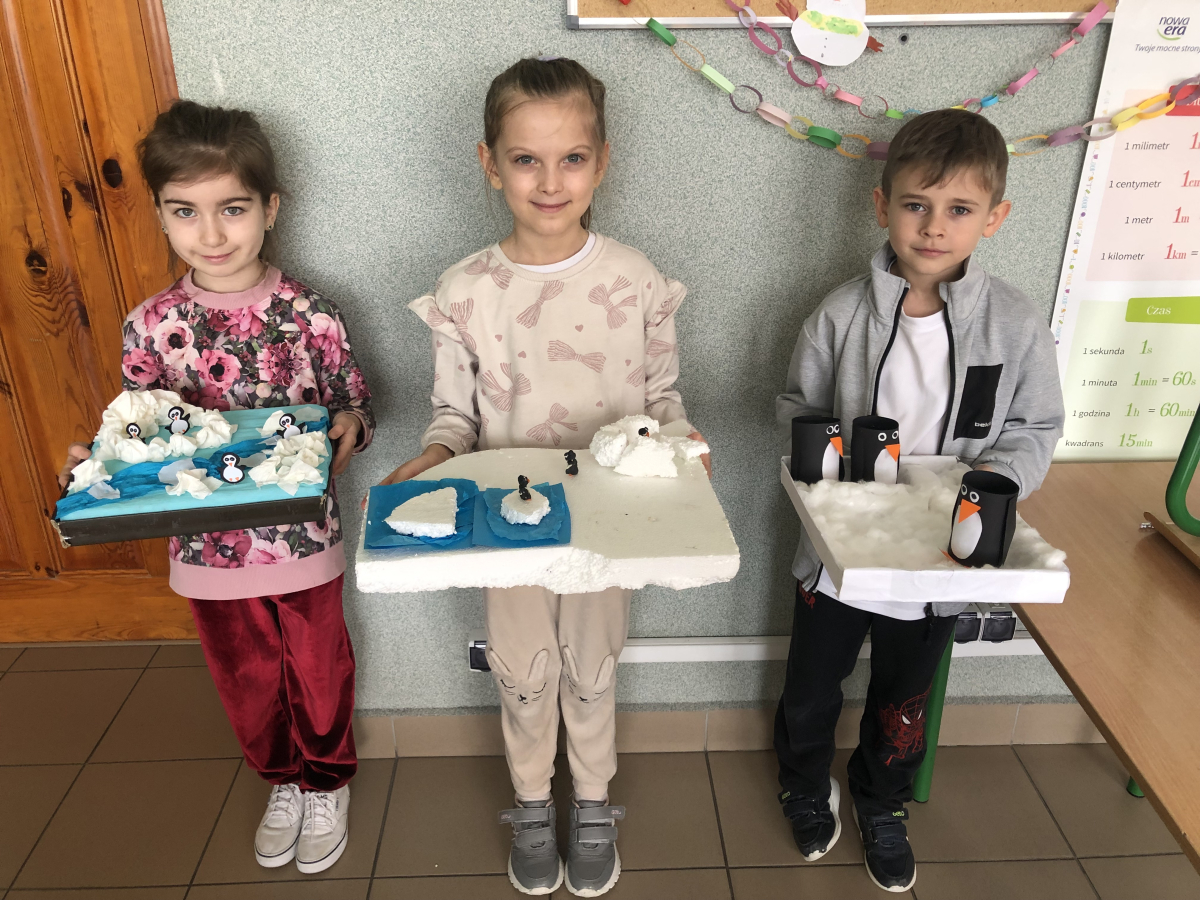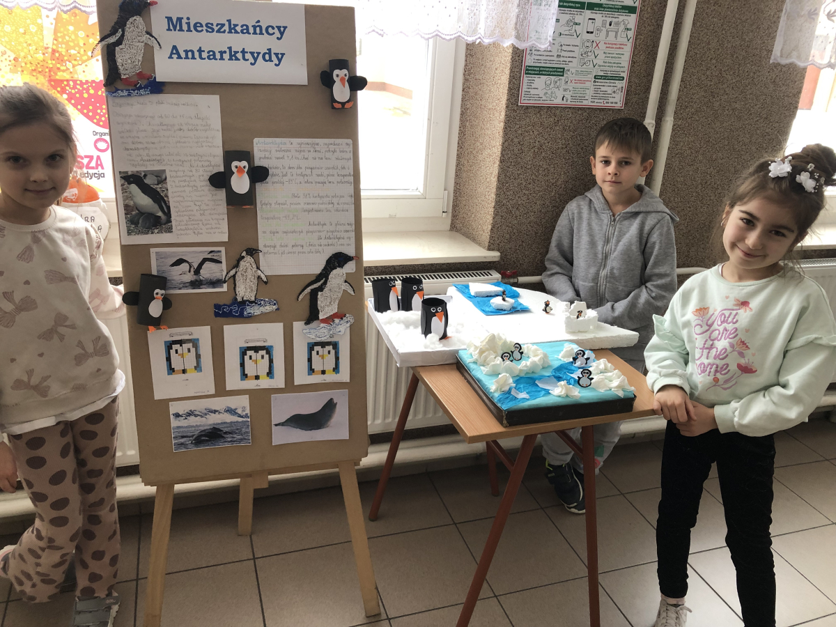 Przez tydzień uczniowie klasy II wraz z wychowawcą Krystyną Wilk pracowali metodą projektu. Tematem projektu były bieguny, a w szczególności biegun południowy - Antarktyda i żyjące na niej pingwiny Adeli. Prace zaczęliśmy od omawiania lektury “ Zaczarowana zagroda” A. Cz. Centkiewicz. Zbieraliśmy materiały i ciekawostki dotyczące Antarktydy, pracy polarników, zwierząt tam żyjących, a w szczególności pingwinów. Poznaliśmy budowę pingwinów. Oglądaliśmy filmy o klimacie i zwierzętach żyjących na Antarktydzie. Przygodę uczniowie zakończyli wykonując zaczarowane zagrody wraz z pingwinkami. Na zajęciach komputerowych uczniowie wykonywali pingwiny długopisami 3D. Wiele informacji na temat zimowej krainy i życia na niej uczniowie zdobywali samodzielnie.