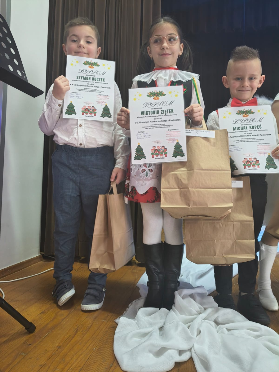 Z radością informujemy, że Wiktoria Z., Michał K. oraz Szymon B. z Oddziału Przedszkolnego naszej szkoły zaprezentowali się bardzo pięknie i zdobyli dyplomy za udział w konkursie. Każdy został wyróżniony I miejscem. Dzieci wykazały się odwagą, zaangażowaniem oraz umiejętnościami muzycznymi.