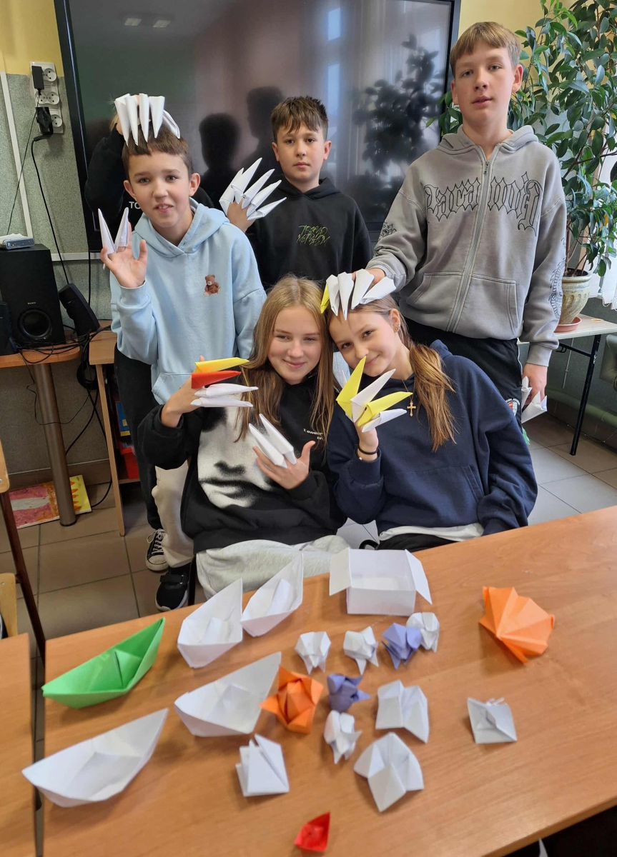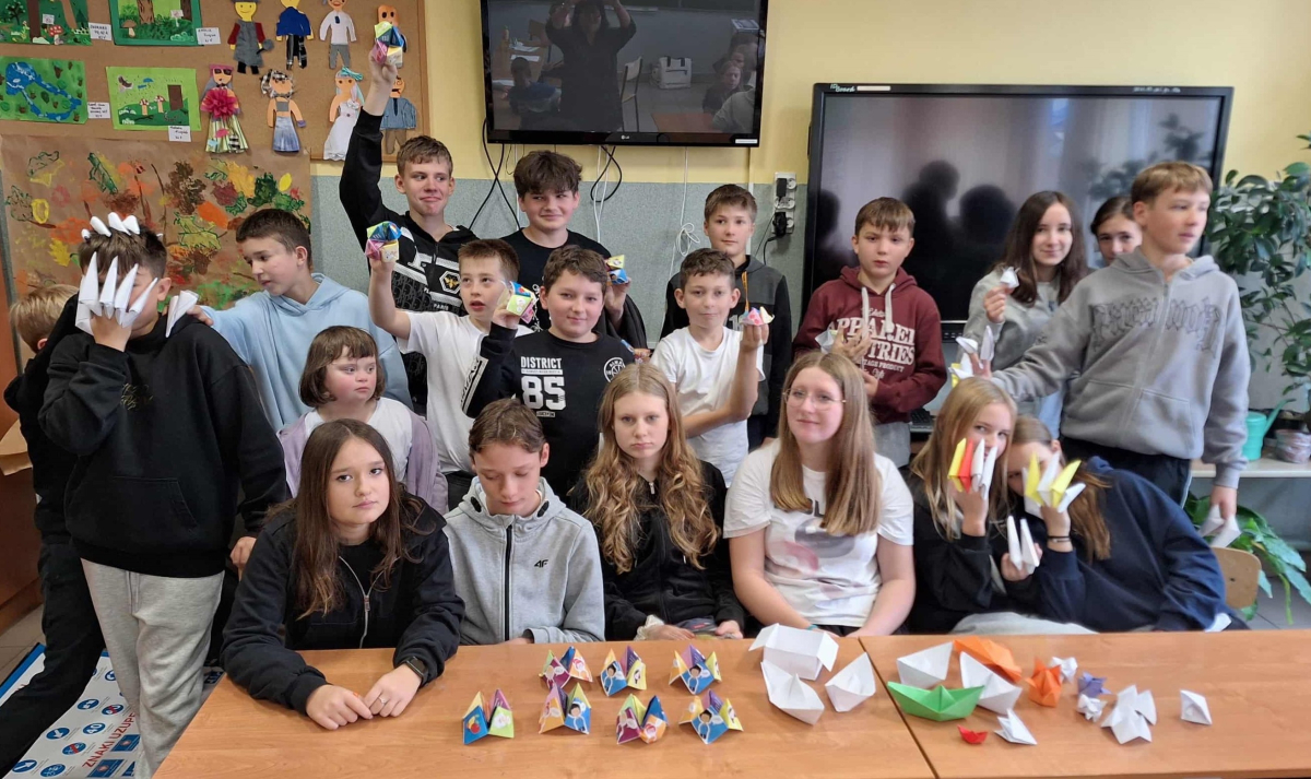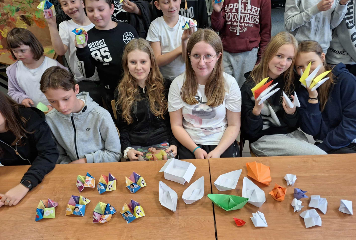 W dniu 12 listopada nasza szkoła włączyła się w akcję „Europejskiej Odsłony Światowych Dni Origami z EUROPE DIRECT Rzeszów 2025”. Celem przedsięwzięcia było popularyzowanie sztuki origami wśród dzieci i młodzieży oraz promowanie kreatywności, cierpliwości i współpracy w duchu europejskiej integracji. Nauczyciele przygotowali warsztaty, w trakcie których uczniowie tworzyli papierowe formy: kwiaty, motyle, łodzie, samoloty, pudełeczka itp. Wykorzystano również gotowe materiały dotyczące wiadomości na temat Unii Europejskiej, przyrody i zdrowego odżywiania. Młodzież klas starszych chętnie odpowiadała na zawarte w nich pytania. Składanie papierowych figur wymagało skupienia i dokładności, ale dawało też dużo satysfakcji i radości. Origami to nie tylko zabawa, lecz także sposób na rozwijanie cierpliwości i wytrwałości, ale także współpracy, szacunku i otwartości.