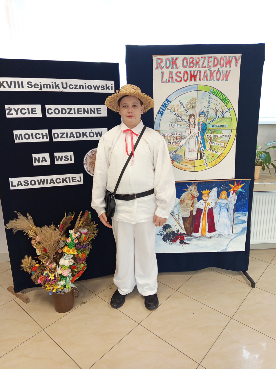 W dniu 11 lutego 2026 roku w Kolbuszowej w Zespole Szkół Technicznych odbył się XVIII Powiatowy Sejmik Uczniowski. Tematem przewodnim było: „Życie codzienne moich dziadków na wsi lasowiackiej ”. Naszą szkołę reprezentował Przemysław Ozga uczeń klasy szóstej, który otrzymał wyróżnienie za prezentację nt. lasowiackiego stroju. Gratulujemy